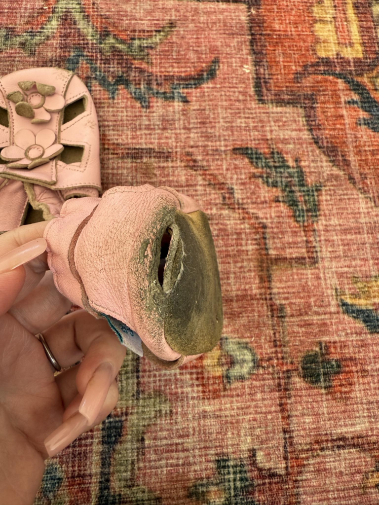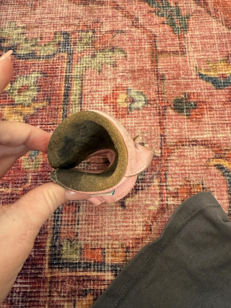Wat we geweldig vinden aan de zool is dat deze van suède is. Hij is dun en flexibel, waardoor de kinderen goed grip hebben op de vloer en ook de grond eronder kunnen voelen. De suède zool is stevig; we hebben nog nooit een gat in de zool gehad. Bovendien blijven de voeten droog in natte omstandigheden, tenzij ze natuurlijk in een plas stappen (proberen een peuter tegen te houden bij een plas? Veel succes!).